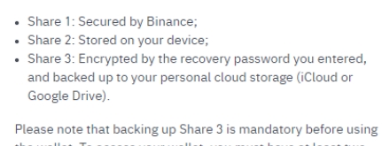 2. 创建钱包。点击【创建钱包】并按照说明进行操作。币安 web3 钱包采用多方计算 (mpc) 技术,因此无需费心保管助记词。该技术将生成三个“密钥分片”,分别存储在三个不同的位置。