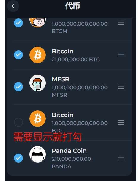 3、之后你会在看到钱包地址里所有的代币,如果你要它显示出来,就打勾。不想让他显示,就去除选项,就可以了