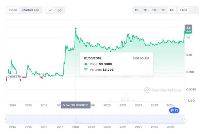 2012年xrp首次发行时价格仅为几美分,随着ripple协议的推出以及与一些金融机构的合作,xrp价格在2013至2014年间逐步上涨,最高达到约0.10美元。2017年末,在整个加密市场的牛市推动下,xrp迎来了第一次大幅上涨,特别是在2017年12月,xrp的价格突破3美元创下历史新高,一跃成为当时市值第三大的加密资产。