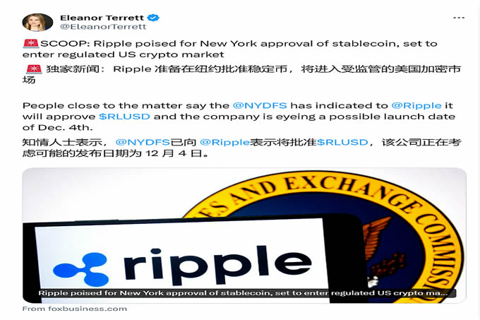 据11月30日福克斯商业报道称,纽约金融服务部已向支付公司 ripple(与 xrp 密切相关)暗示将批准该公司神奇的 rlusd 稳定币。如果获得批准,ripple 将可以合法向公众提供 rlusd。