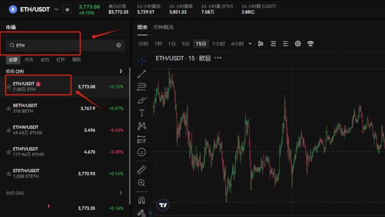 10、在搜索框输入eth,选择eth/usdt交易对,可以看到eth实时行情