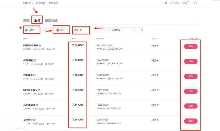 11、在【c2c交易】页面点击【出售】,币种选择【usdt】法币选择【cny】,交易方式选择【银行卡】就是用银行卡进行交易,也可选择其它方式,选择合适的商家,点击【出售usdt】 即可