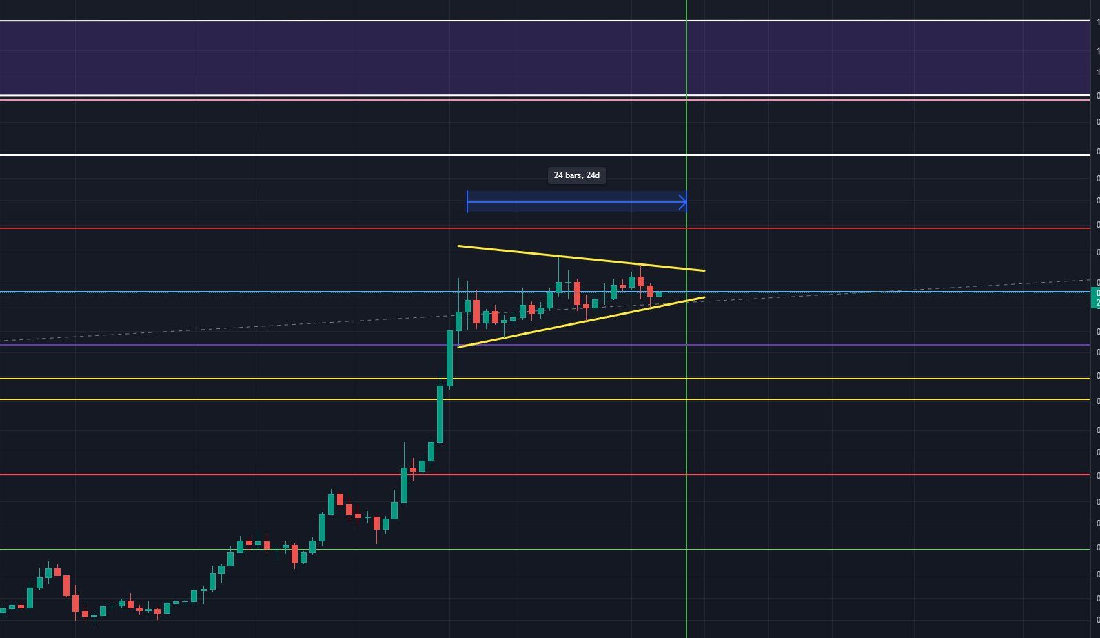 kevin 提到,在上一个牛市周期中,狗狗币($doge)经历了类似的模式:大涨后盘整24 天,随后再次飙高,达到了他所称的「宏观黄金口袋」。