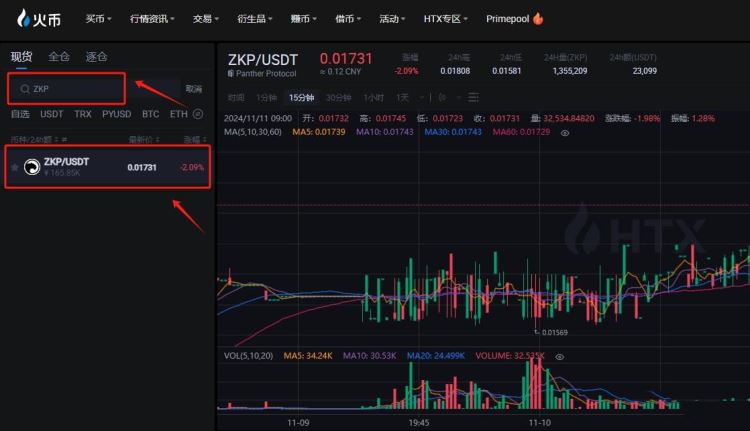 4、搜索zkp,选择zkp/usdt交易对