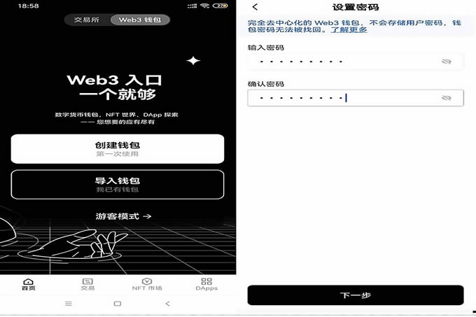 登录欧易app,选择首页上方【web3钱包】,点击【创建钱包】、在弹出的【设置密码】中,输入密码并进行确认,可以创建成功。
