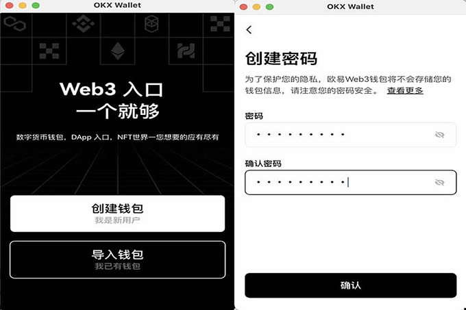 下载【欧易web3钱包】插件,在弹出的插件窗口中,点击【创建钱包】,完成【创建密码】。