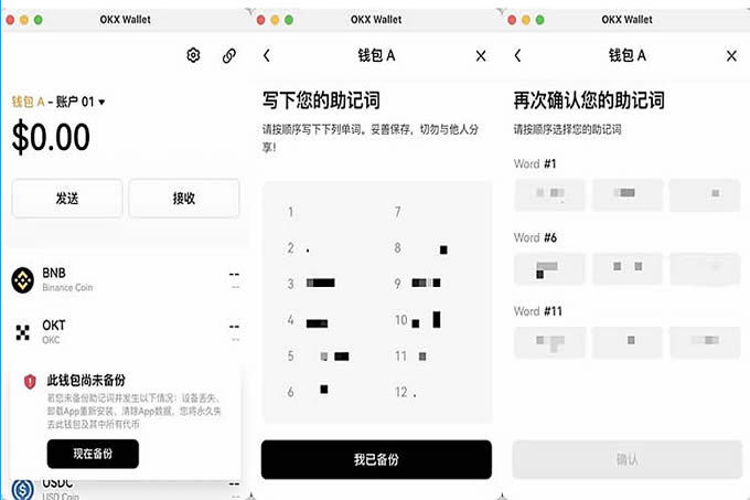同时按照提示进行助记词备份,点击【现在备份】、【我已备份】,并对助记词进行验证。