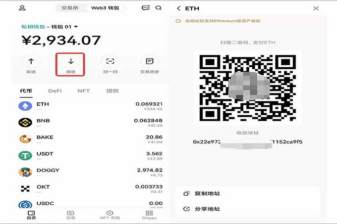 点击【接收】,选择转入币种,会弹出收款地址,复制地址粘贴到其他平台或者钱包的提币界面,便可以将数字资产成功充入web3钱包。