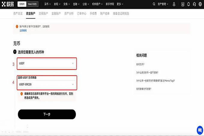 2、选择您需要充入的币种【usdt】—选择usdt可用的充币网络【usdt-erc20/usdt-trc20/usdt-oktc】—【下一步】;注意:选择充值usdt币种时,此地址只能充入tether(usdt),请勿充入其他币种,否则您充入的资产将无法找回。