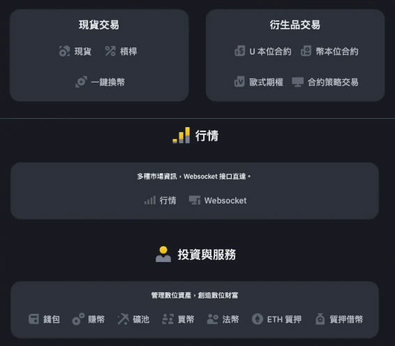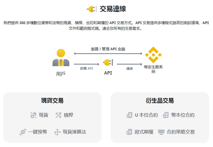 币安提供多种api 项目,包含现货、杠杆、合约和期权交易,连理财功能也有支援,种类非常多,你可以从这个网页:币安api 官网,连接到各个api 项目的说明文件。