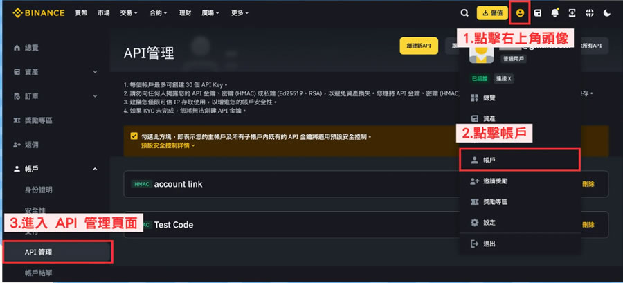 币安api 设定步骤二:前往币安帐户的api 管理页面