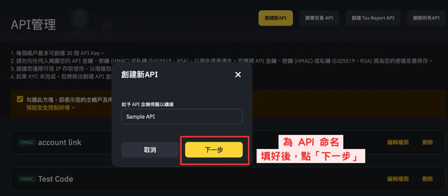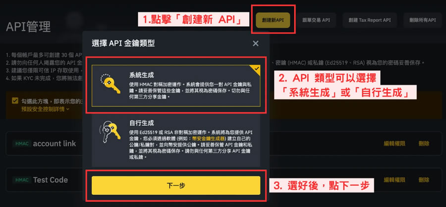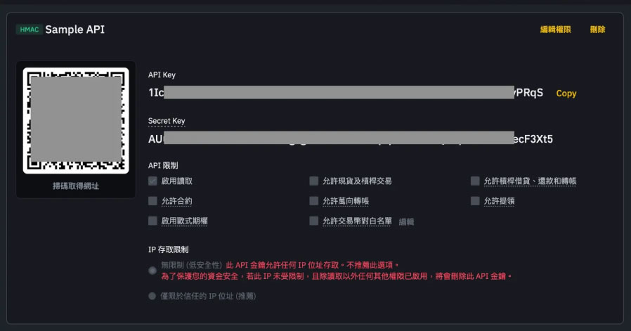 这步骤完成后,你就会拿到一组新的api,包含金钥( api key) 与密钥(secret key),记得要将这两个密码储存好,放在安全的地方,避免外泄。