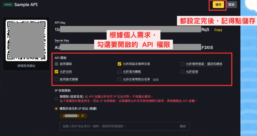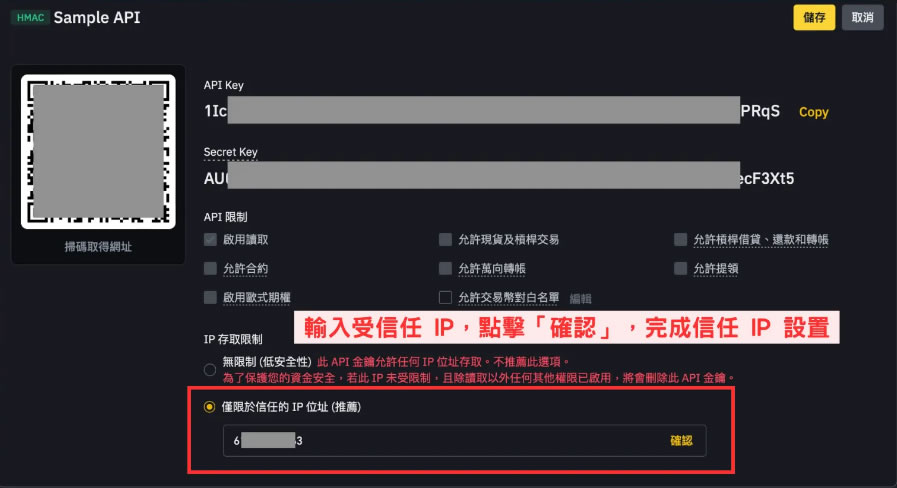 如果要开启合约/现货交易,或转帐功能等会动到你的钱的操作,你必须先设定「信任ip 位址」,不然币安不会让你开启!