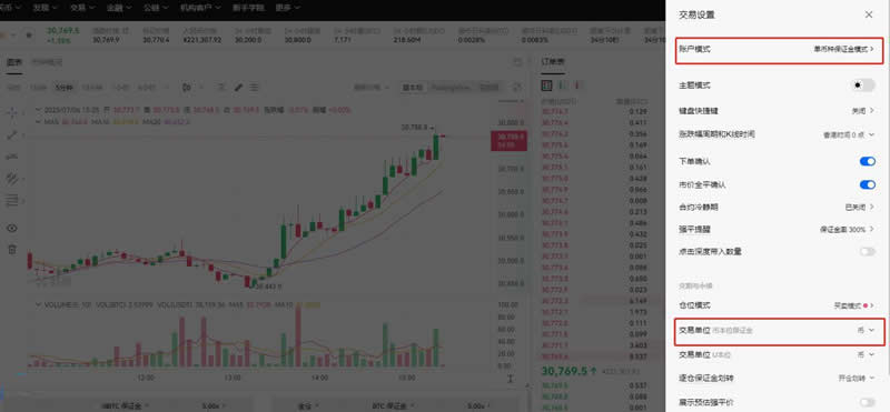 4、点击交易页面右上角设置图标—【交易设置】—选择【账户模式】【交易单位】等选项进行设置。