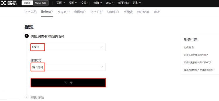 3.打开欧易交易所(没有账号的投资者可以点此注册新账号),在首页点击【资产管理】选择【提现】进入提现页面
