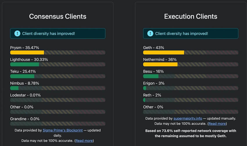 - 关键价值:即使某个client 出现bug,也不会影响整体网路,因为每个client 的使用比例均低于50%,而以太坊的共识机制是至少需要2/3 的节点同意才能让区块finalize,因此能够避免单一bug 导致整条链分岔