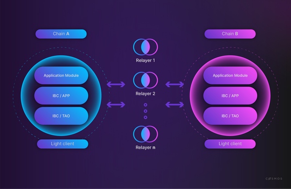 relayer通信,relayer相当于ibc协议中的物理层连接,relayer会扫描运行ibc协议的链,并负责向其他链报告最新的状态。 - 多个