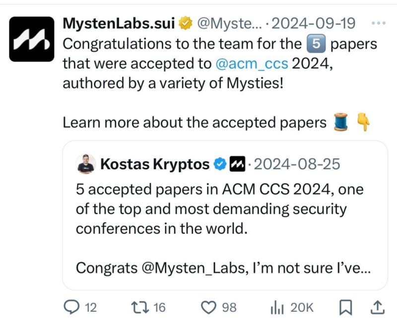 sui 开发商 mysten labs 的学术研究成绩非常优异,最新又有 5 篇文章被计算机行业顶会 acm ccs 接受。提到工程能力,除了所有人看在眼里的 sui 公链外,他们还推出了基于 sui 的去中心化存储协议 walrus ,并准备接入 scion 网络标准。此外,sui 还准备实现无网络情况下通过电波发送交易。