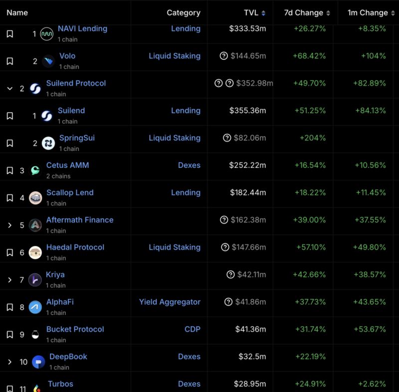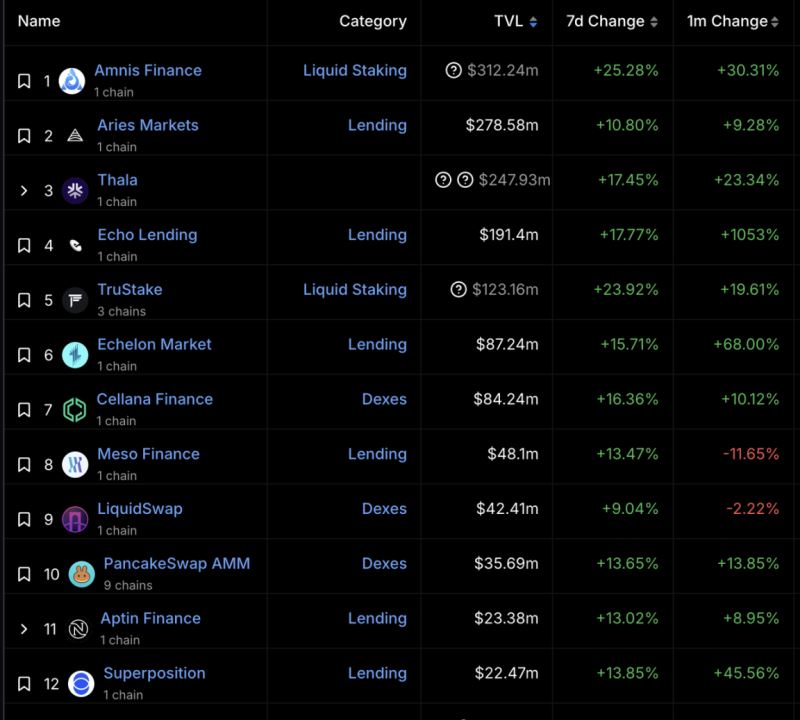 sui 首先对生态 defi 项目给予代币激励吸引 tvl,tvl 成功大幅上升。aptos 后来也开始给生态项目代币补贴。