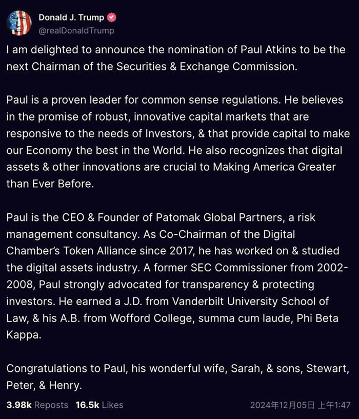 在川普竞选期间承诺重塑加密货币监管环境的背景下,他在truth social 上正式提名paul atkins 出任美国证券交易委员会(sec)主席。这一任命不仅震撼整个金融科技圈,更引发加密货币产业的广泛关注和极大期待。