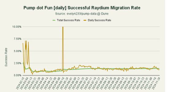 大约每100个代币中就有一个从pump.fun“毕业”,这是由于巨大的饱和和有限的流动性以及其他超出本文范围的原因。那些走上擂台的人必须展示一些有趣的、令人震惊的独特的东西,才能让战壕里的战士们注意到。尽管存在这些困难,但该协议很快就确立了自己作为交易微市值代币和发布新代币的名符其实的门户地位,迅速超越了该领域的所有其他竞对。