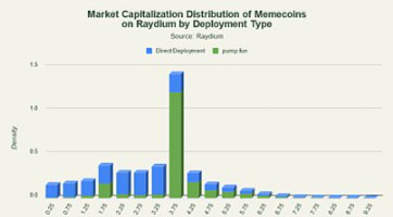 请注意,pump.fun代币需要超过一定的市值门槛才能获得流动性池,由于发行时提供的流动性更多,因此它们的价值通常更高,多处于5000到15000美元范围内。这表明大多数发布代币无法维持或超过迁移到raydium之前的市值。这些代币也有很多处于中档区间(数十万到小几百万),因为部署管道在某种程度上过滤了不吸引人的meme,并允许社区利用此过程中在平台上获得的名声或牵引力作为增长催化剂。