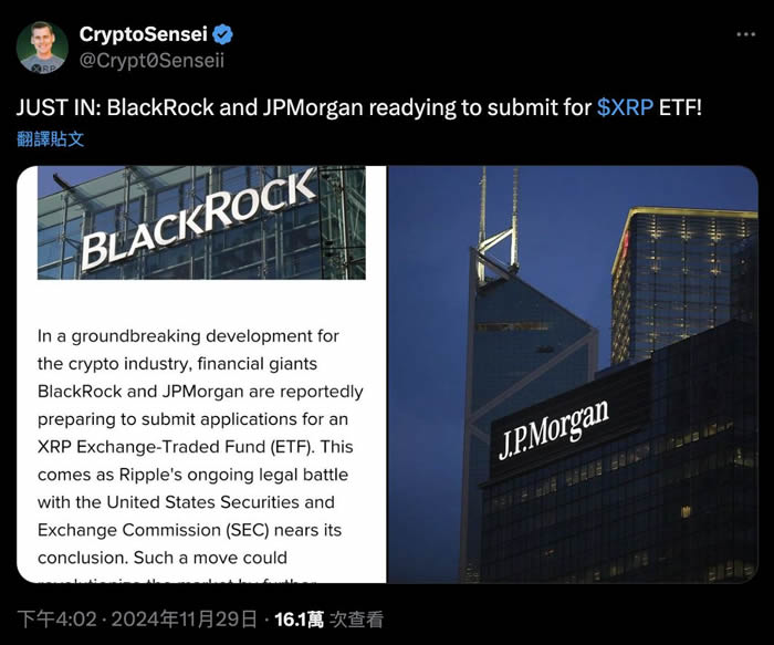 贝莱德和摩根大通等资产管理公司已经开始申请$xrp 相关etf