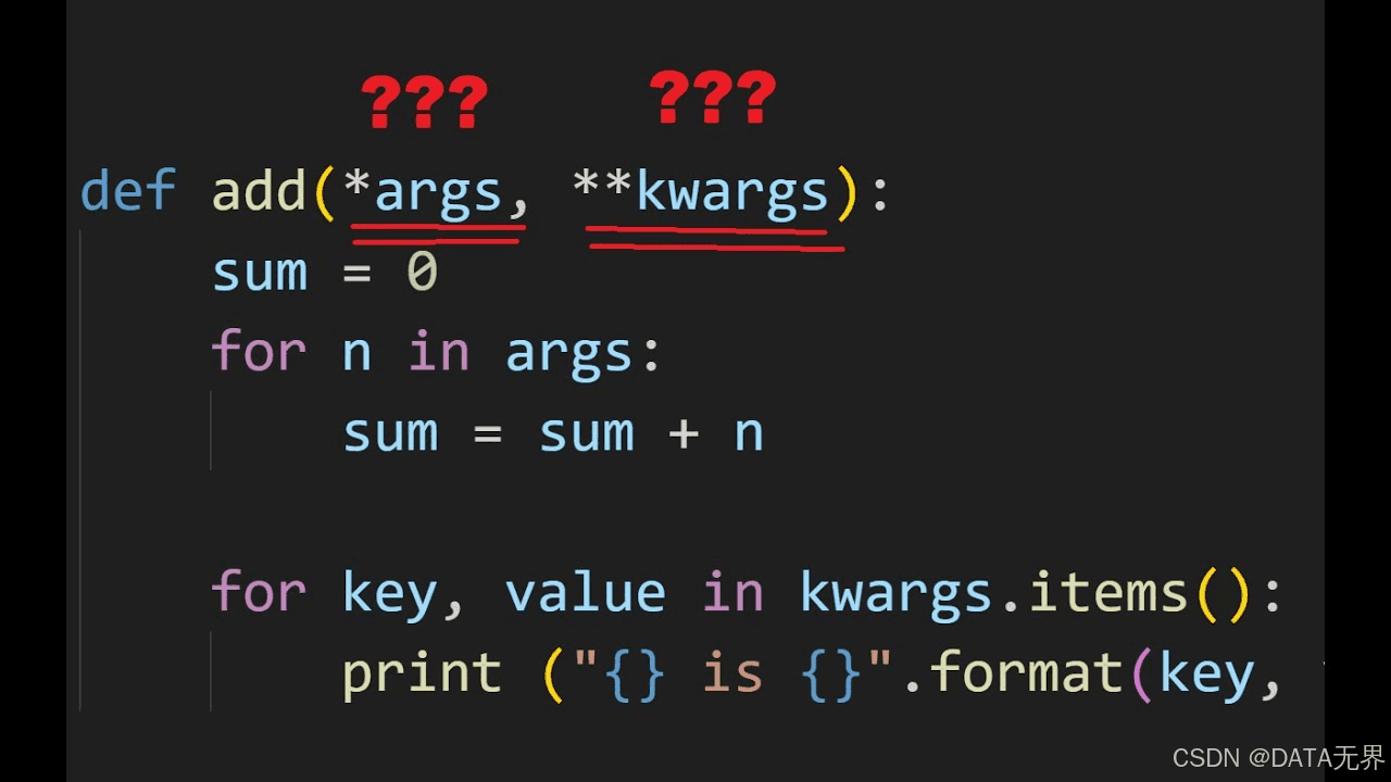 **kwargs 允许函数接受任意数量的关键字参数,这些参数会以字典的形式传入函数内部。