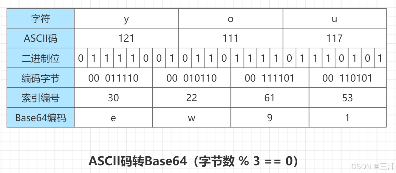 示例1,正好有3个字符时: ascii编码you,base64编码ew91。
