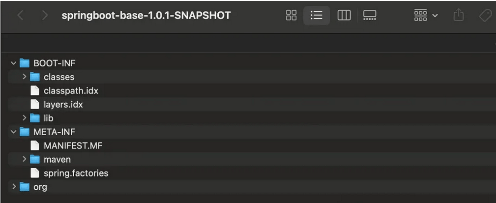 (如果项目中有静态资源文件,在 boot-inf 下还会有相应的目录,如 static、templates等。)