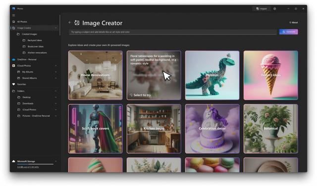 此外照片应用新增 image creator 和 restyle image 功能,分别用于根据文本生成图像和对现有照片应用艺术风格。