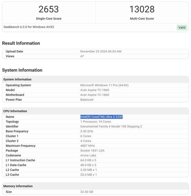 根据geekbench平台的爆料,core ultra 5 225f的单核性能得分为2653分,多核性能得分为13028分,请参阅上图。