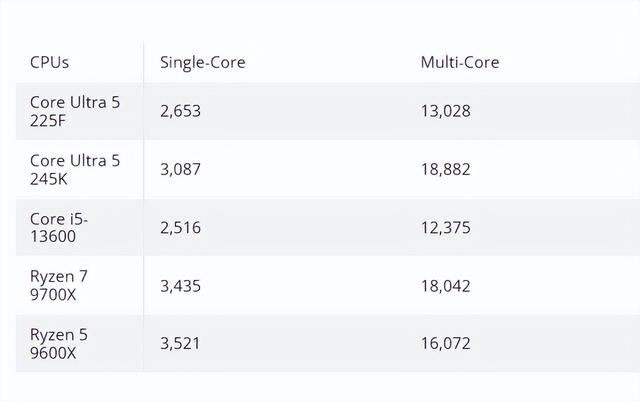 按百分比计算,ryzen 5 9600x的单核性能和多核性能分别比core ultra 5 225f高33%和23%,“大幅”领先。在这种情况下,core ultra 5 225f和ryzen 7 9700x对比的资格都没有。