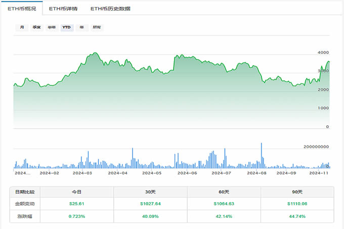eth在过去 24 小时内上涨了 5.75%,于 11 月 28 日达到 3,640 美元左右。第二大加密货币的表现超过了加密货币市场的涨幅,后者在同一时期上涨了 2.82%。