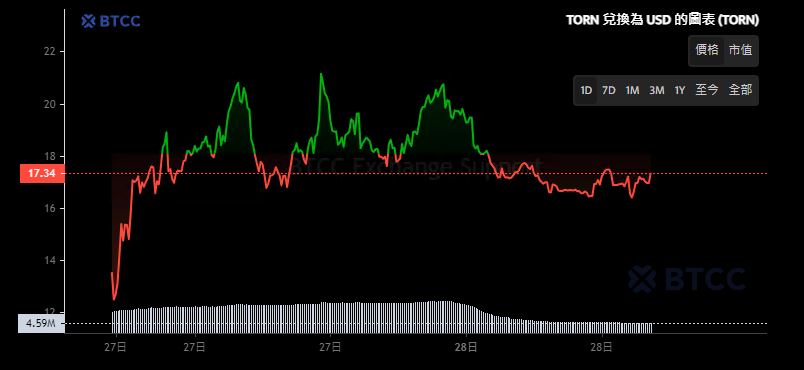 截止2024-11-28 07:27:53,tornado cash 代币售价为1 torn= 5.1795 美元(约新台币167.08 元),较过去24 小时上涨了0.00%。