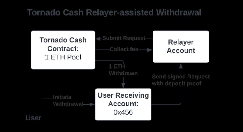 从tornado cash 提取加密货币的人也可以使用「中继器」程式。中继者接收提款请求,然后代表用户将其提交给tornado cash。因此,该人可以从tornado cash 提取加密货币,而无需将提款交易直接连结到他们的加密钱包位址,从而进一步保护他们的隐私。
