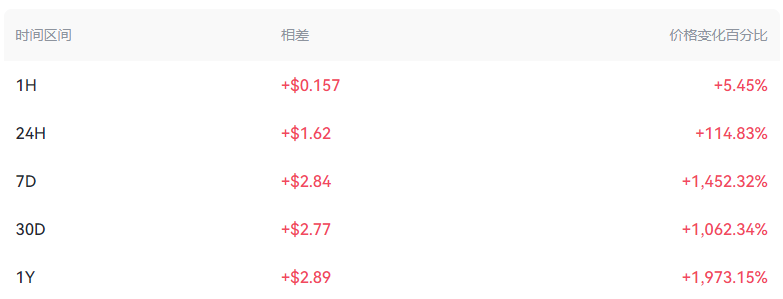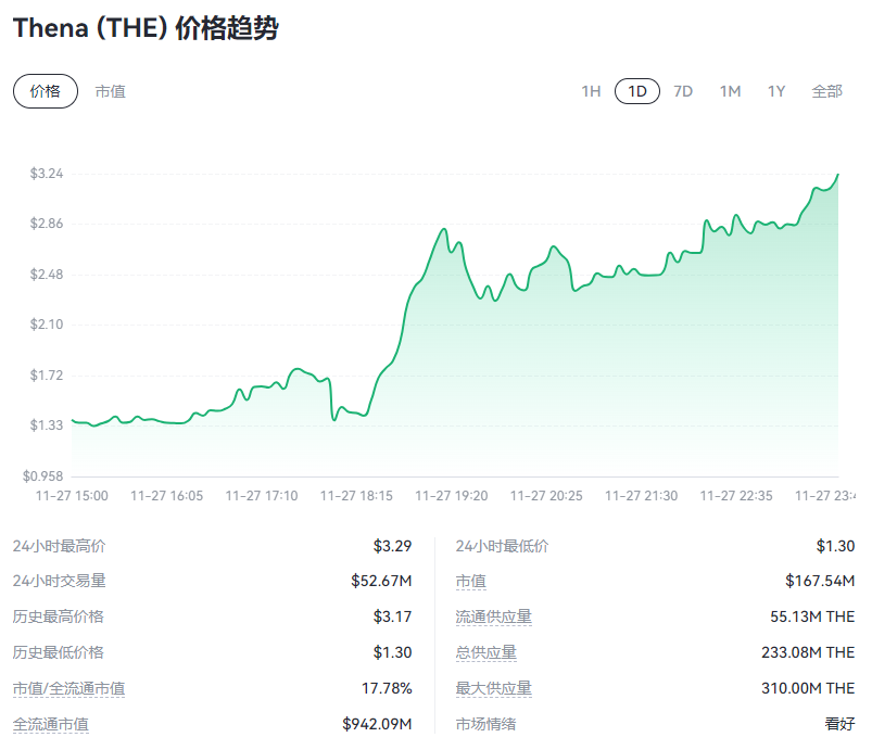 thena (the)的当前价格为$3.24,这也是近24小时的+124.29%,以及近7天的+1,452.32%。