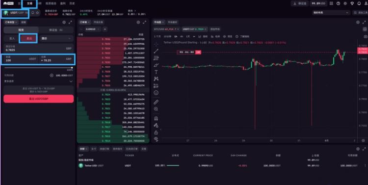 6、点击交易,选择usdt/gbp,选择卖出usdt,输入usdt的数量