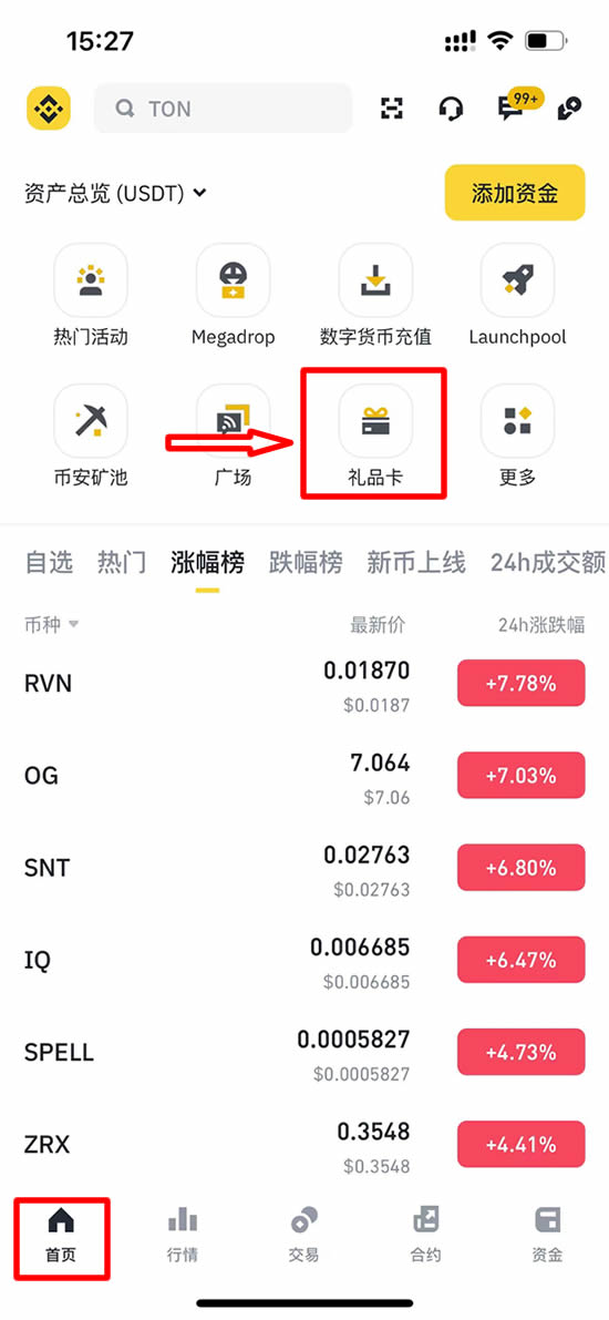 1、打开币安官网(官方注册 官方下载),购买或收到礼品卡后,登录币安app,然后点击【资金】-【资金账户】-【礼品卡】。