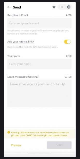 如果您的接收者目前不是币安用户,您在发送礼品卡时,可通过切换【添加您的推荐链接?】选项来绑定您的邀请码。随后,接收者可以使用您的邀请码注册币安账户。