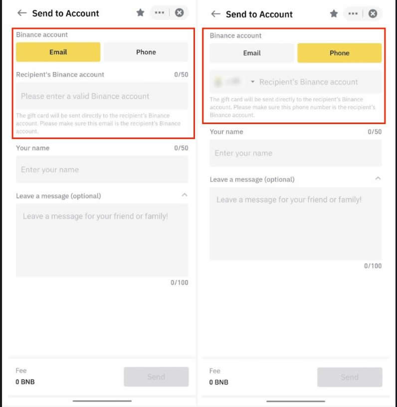6、点击【发送至账户】,然后输入接收方的币安账户邮箱地址或电话号码。确认金额后,点击【发送】即可发出礼品卡。