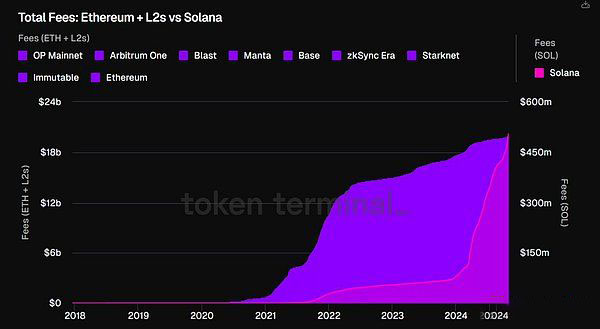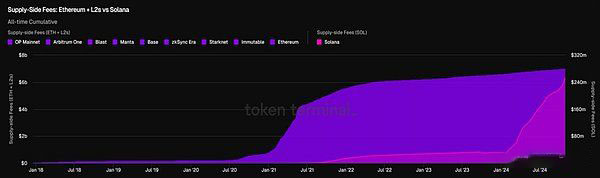 以太坊和顶级 l2 的总费用接近 200 亿美元。97.5% 的费用来自 l1(顶级 l2 的费用为 4.79 亿美元)。solana的历史总费用为 4.95 亿美元,其中 87% 是今年产生的。