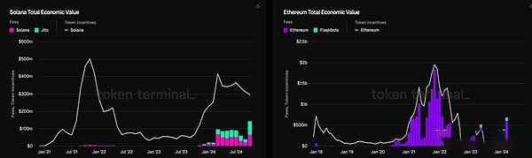 solana的实际经济价值中有超过 51% 来自 mev(通过 jito 费用衡量),而以太坊为 29%(通过 flashbots 费用衡量)。
