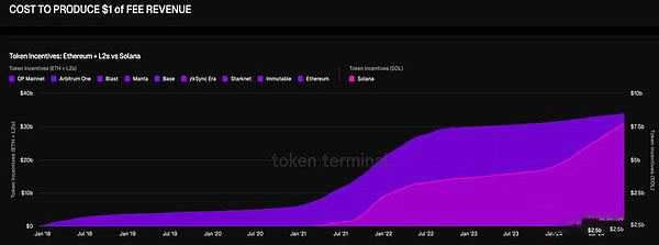 solana是如何弥补差距的?通过token激励/通货膨胀。索solana今年迄今已发放 32 亿美元的激励支付,而以太坊为 23 亿美元。