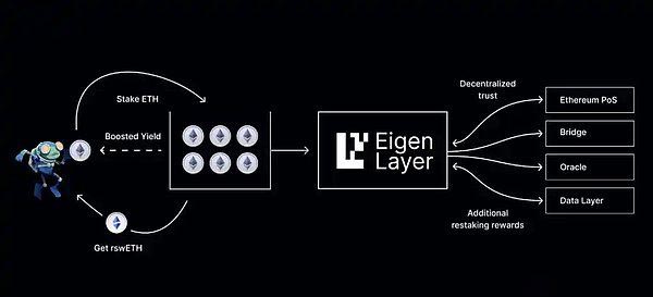简单来说,再质押是指使用已经质押过的资产,再次为特定去中心化服务提供安全保障。虽然看似不太重要,但实际上这是本周期中最具前景的创新之一。该概念由 eigenlayer 首创,并于 2023 年 6 月首次在以太坊主网上上线。