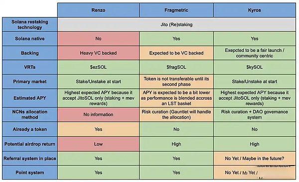 1. 风险:在风险方面,主要关注协议惩罚(即惩罚风险)和流动性风险。由于当前 ncn 数量较少且处于早期阶段,可以认为所有提供者的风险基本相同。renzo 和 kyros 接受流动性最好的 jitosol,而 fragmetric 接受更多种类的流动性质押代币(lst),这可能会增加其流动性风险。此外,renzo 和 kyros 的 vrt 将从一开始就具备流动性,而 fragmetric 的代币初期不可转移。因此,就风险而言,renzo 和 kyros 风险最低,fragmetric 风险略高。
