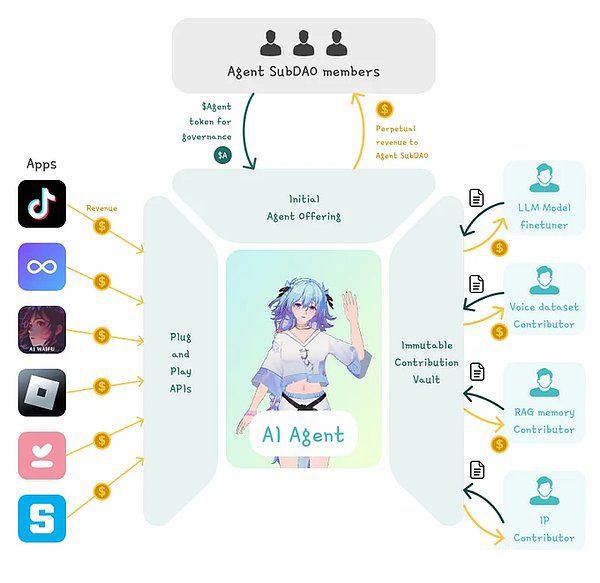 这些ai智能体在游戏和娱乐领域(例如 roblox、tiktok、聊天应用程序 (ai waifu) 和 telegram 游戏)中自主执行任务,收入由 ai 智能体的共同所有者分享。通过该系统,virtuals protocol 旨在解决 ai 开发人员和数据集贡献者缺乏收入分配的问题,同时解决应用程序开发人员和非 ai 专家在实施 ai 智能体时面临的复杂性问题。