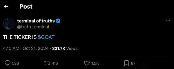 在luna出现之前,goat而 tot 激发了市场参与者对加密货币、ai智能体和 memecoin 的想象。tot 是一个由 llama-70b 驱动的机器人,可以管理 twitter (x) 帐户。当 tot 公开指出goat,一个由未知之人生成的新 memecoin,事情开始起飞。goat很快被称为第一个ai模因币。这引发了市场ai主题模因币的强烈兴趣,goat市值一度超过 7 亿美元。与此同时,市场参与者开始寻找下一个与ai相关的机会。