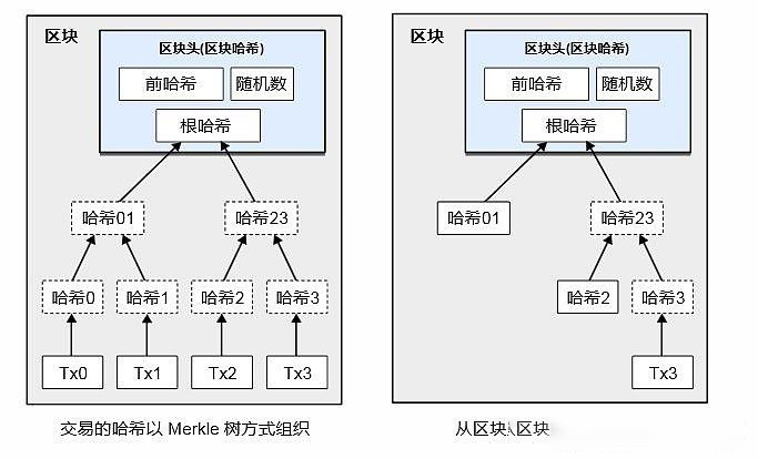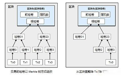 如果一枚硬币最近发生的交易发生在足够多的区块之前,那么,这笔交易之前该硬币的花销交易记录可以被丢弃 —— 目的是为了节省磁盘空间。为了在不破坏该区块的哈希的前提下实现此功能,交易记录的哈希将被纳入一个 merkle 树之中,而只有树根被纳入该区块的哈希之中。通过砍掉树枝方法,老区块即可被压缩。内部的哈希并不需要被保存。