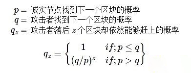 攻击者能够从落后局面追平的概率类似于赌徒破产问题。假设,一个拿着无限筹 码的赌徒,从亏空开始,允许他赌无限次,目标是填补上已有的亏空。我们能算出他最终能填补亏空的概率,也就是攻击者能够赶上诚实链的概率[8],如下:
